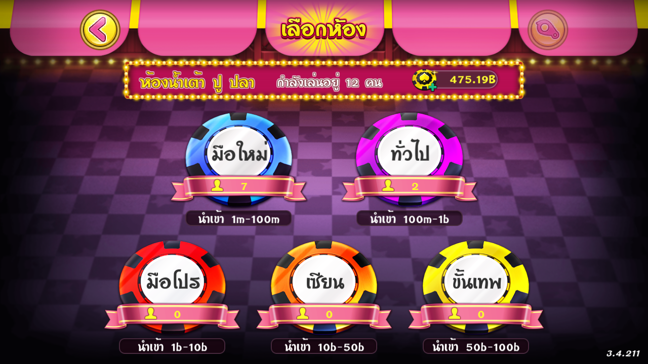 1.เข้าเกม กด น้ำเต้าปูปลา หรือกดสัญลักษณ์ [:::] เพื่อเลือกประเภทห้องการเดิมพัน