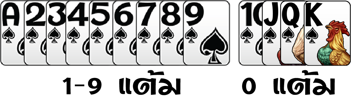 โดยตัวเลขจะมีค่าตามเลขนั้น ๆ ยกเว้น 10 J Q K นับเป็น 0 ส่วน A นับเป็น 1 แต้มที่รวมกันเกิน สิบ ให้ทำการตัดเลขหลักสิบ ออก เหลือแต่เลขหลักหน่วยไว้